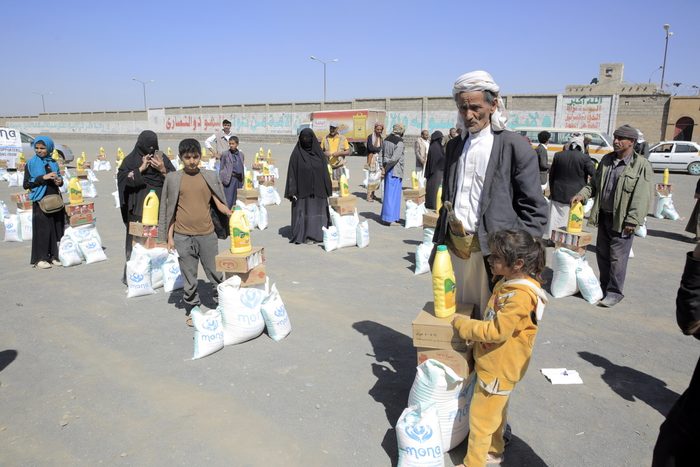 Yemenis receive food aid amid a hunger crisis, in Sana'a, Yemen, 26 February 2023. (Keystone/EPA/Yahya Arhab)