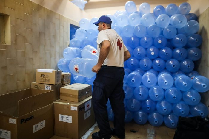 Red Cross workers deliver water purification kits in Caracas, Venezuela, in 2019. Global aid organisations like the ICRC have worldwide operations that produce their fareshare of carbon emissions. A new Geneva-based initiative is helping them decarbonise. (Credit: Keystone/EPA/Miguel Gutierrez)