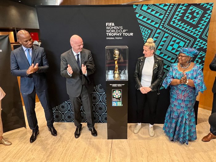 French footballer Didier Drogba, Fifa president Gianni Infantino, German footballer Anja Mittag and WTO president unveiling the 2023 Women's World Cup award at WTO headquarters, 1 May 2023. (Geneva Solutions/Paula Dupraz-Dobias)