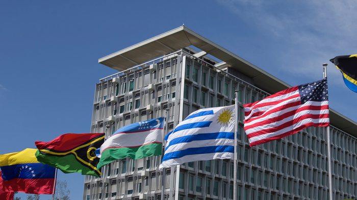 Flags flying in front of the World Health Organization in Geneva. (US Permanent Mission in Geneva/Flickr)
