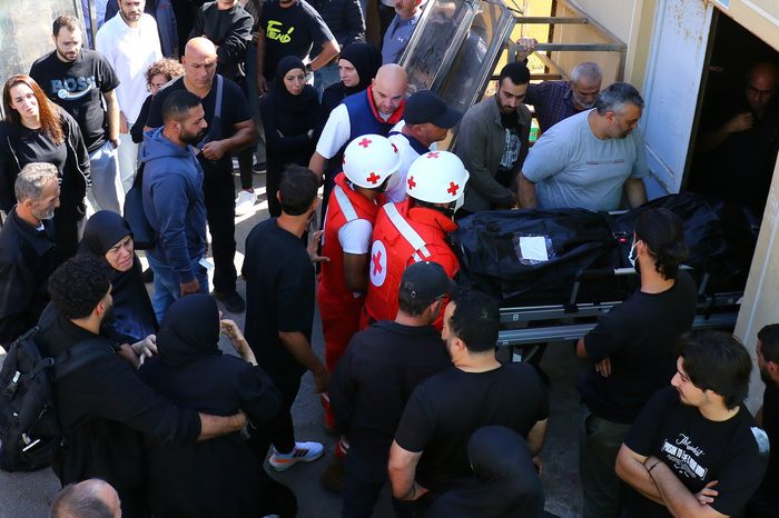 Red Cross members carry the bodies of three journalists killed in an Israeli raid in southern Lebanon at a hospital in Beirut, Lebanon, 25 October 2024. (Keystone/EPA/STR)