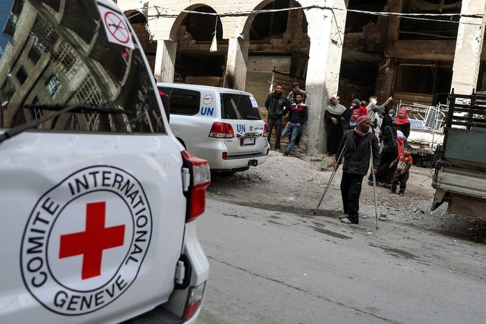 People gather near UN and ICRC cars in rebel-held Douma, Syria, 15 March 2018. (Credit: Keystone/EPA/Mohammed Badra)