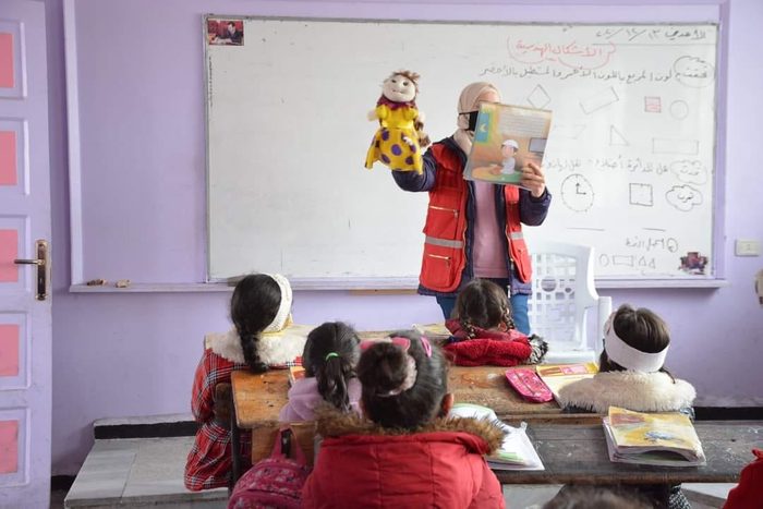 A Syrian Arab Red Crescent volunteer hosts a psychosocial support session for Syrian children. (Credit: Syrian Arab Red Crescent)