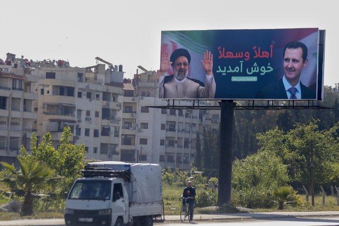 A poster of Iranian President Ebrahim Raisi and Syrian President Bashar Assad with the inscription “Welcome” in Arabic in Damascus, Syria, 3 May 2023, as Raisi landed in Damascus on the first visit by an Iranian head of state to the war-wracked country in over a decade. (Keystone/AP Photo/Omar Sanadiki)
