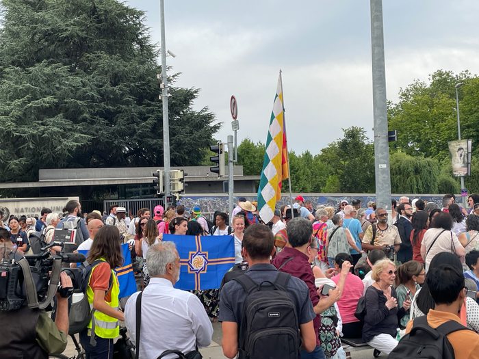 Delegates gather outside the Palais des Nations for the start of the march, 18 July 2023. (Credit: Geneva Environment Network/Harvey Parafina)