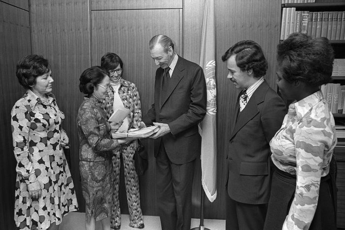 Patricia Koo Tsien, chairperson of the UN Ad Hoc Group on Equality for Women, and Armando Duque, chairman of the UN Staff Council, present a petition signed by 2700 staff members to secretary general Kurt Waldheim requesting an affirmative programme of action to end discrimination against women in the secretariats and agencies, 7 March 1975. (UN/Teddy Chen)