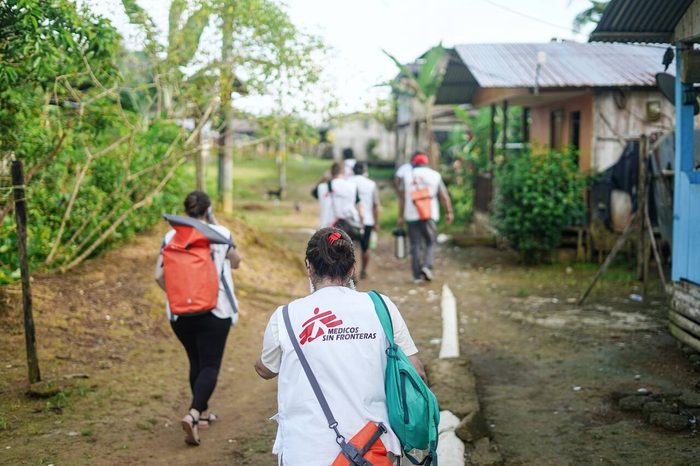 The MSF team walks through Pie de Pato, Chocó, towards a training day for community agents on 8 March 2023. (Geneva Solutions/Daniela Díaz Rangel)